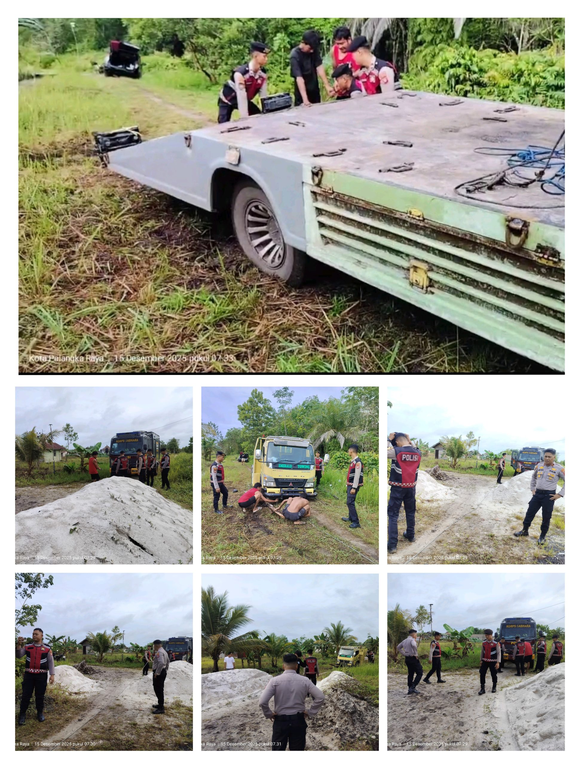 Setelah datang ke lokasi dengan sigap dan cekatan personel muda Samapta Polda Kalteng, langsung mengevaluasi lapangan dan segera menyiapkan tali Sling baja untuk segera menarik mobil Toing Emerald terlebih dahulu. Dengan disaksikan puluhan warga sekitar yang heran dan penasaran, mengapa ada mobil Polisi di lingkungan kompleksnya pagi – pagi, kemudian Tim Samapta Polda Kalteng, melanjutkan dengan gerak cepat dan terkoordinir membantu menarik mobil Inova warga tersebut sampai ke tempat yang aman pada lokasi tanah yang stabil.