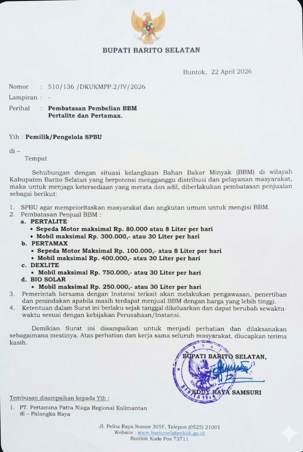 Kepala Dinas Koperasi, UKM, Perindustrian, dan Perdagangan (Diskoperindag) Barito Selatan, Harmito, M.Pd., menjelaskan bahwa kebijakan tersebut ditandai dengan penyerahan surat pembatasan penjualan BBM kepada sejumlah SPBU di wilayah setempat. Surat bernomor 510/136/DKUKMPP.2/IV/2026 itu merupakan tindak lanjut dari arahan Bupati Barito Selatan dalam rangka menjaga distribusi BBM agar tetap merata.