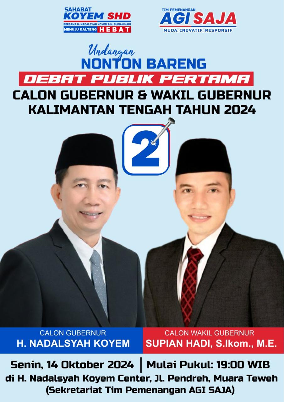 Dalam pantauan Faktakalteng.id di media sosial (Medsos), indeks elaktabilitas dan dukungan kepada pasangan Cagub-Cawagub Kalteng 2024 H Nadalsyah (Koyem)-Supian Hadi (SHD) Nomor Urut 02, semakin menanjak naik, dikarenakan kebanyak warga Kalimantan Tengah khususnya mengagumi dan menjagokan sosok kandidat Koyem-SHD No.02 yang akan memenangkan pemilihan Gubernur Kalteng periode 2024-2029 mendatang.